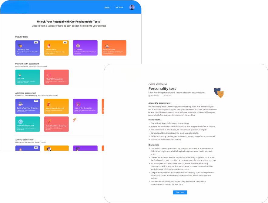 We provide a comprehensive range of psychometric tests to help you understand yourself better. Whether you're looking to explore your personality, assess your mental wellness, or seek insights into conditions, we're here to support you.
